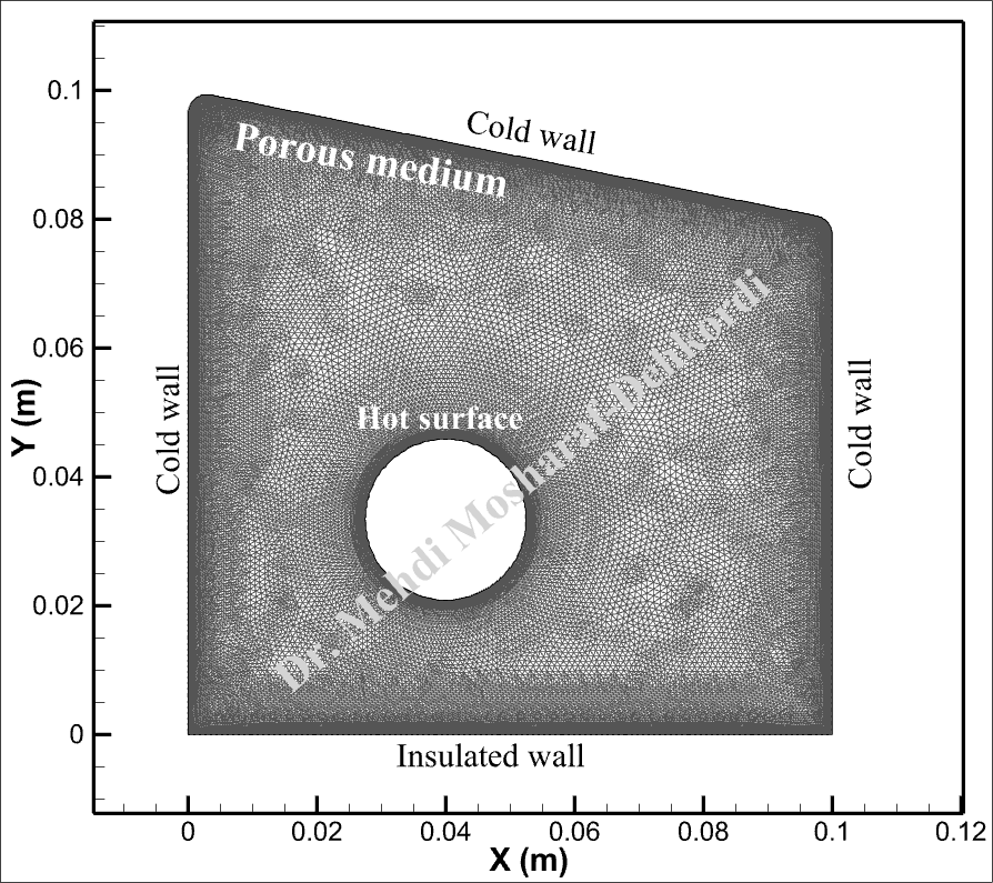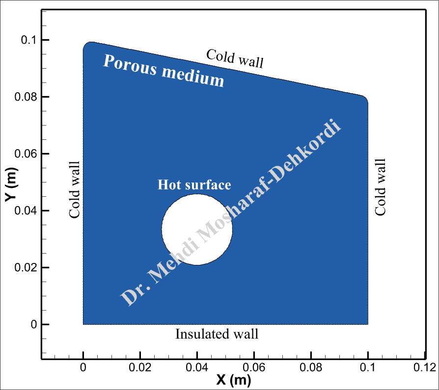 The problem is modeled as a 4-sided polygon shown below, where a circular hot surface is located inside. Three walls of the domain are maintained at a cold temperature, while the bottom wall is thermally insulated. The system is governed by transient natural convection, and the significant outputs of this simulation include velocity vectors, temperature distributions, and their corresponding animations with streamlines.