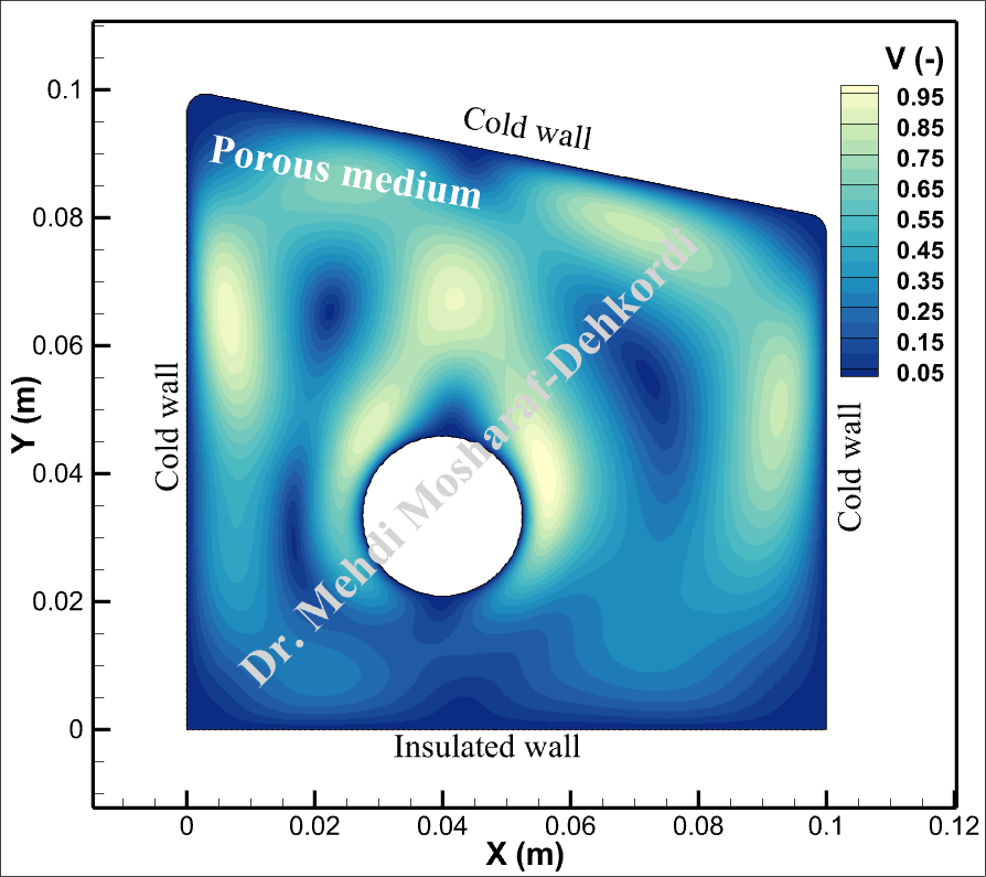 The simulation results reveal intricate patterns of temperature distribution and fluid flow within the porous medium. The animations illustrate the dynamic interactions between the hot surface and surrounding cold walls, showing how natural convection evolves over time. Dimensionless Velocity vectors depict the flow direction and magnitude, while dimensionless temperature contours highlight the thermal gradients across the domain.